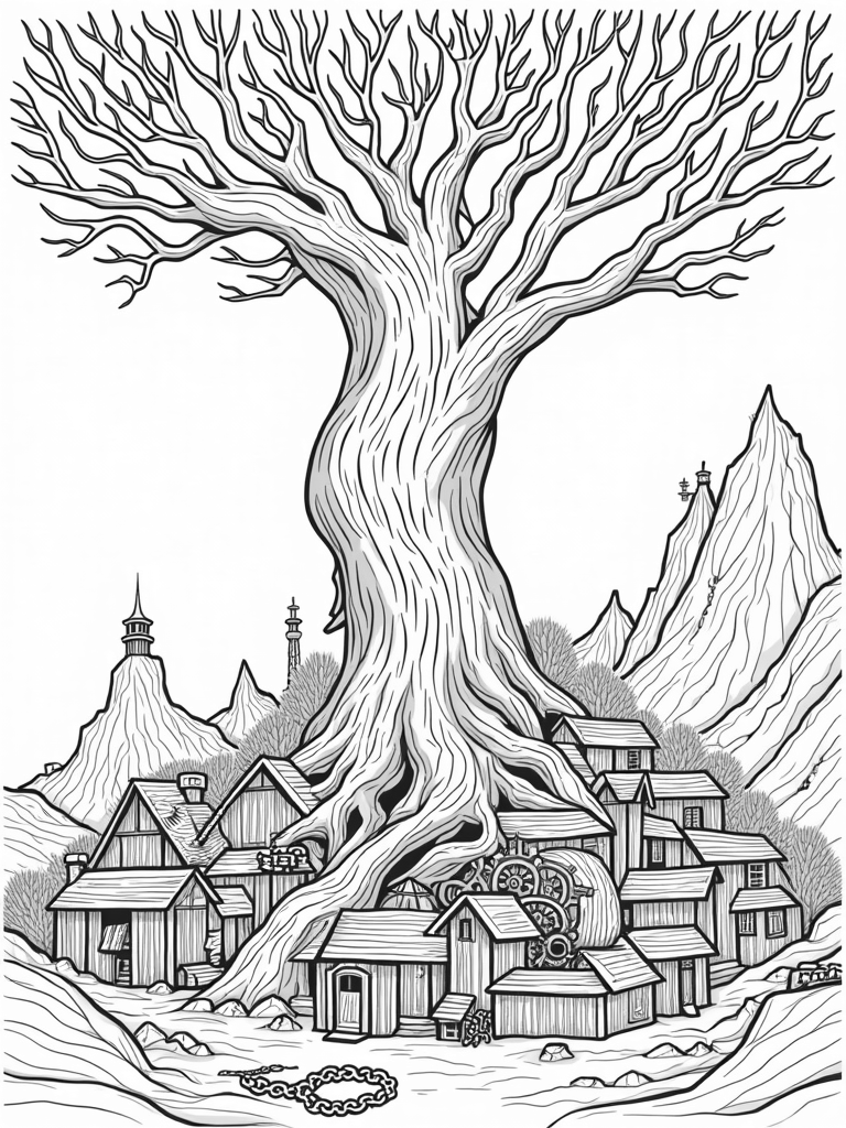 This scene captures a massive tree, its branches twisting toward the sky, covered in ancient runes that tell stories of the past. Underneath, a cozy village made of stone and wood sits quietly, with mossy roofs that blend into the landscape. You can spot oversized gears and broken chains scattered around, giving a sense of a once-busy place now filled with mystery.