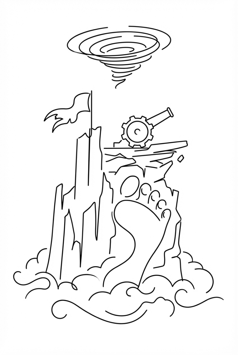 The line art is kept super simple—just clean strokes that capture the shape of each element without any shading. Kids can decide whether the foot is a dark grey or a bright blue, and they get to choose the color of the gear‑cog cannon, the banner, and the stormy clouds. It’s a fun way to let imagination run wild while staying true to the gritty vibe of the Attack on Titan world.