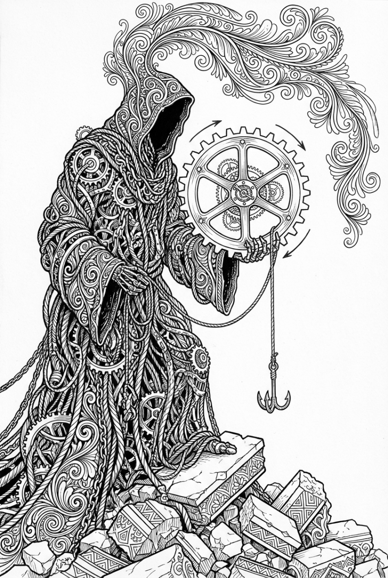 The picture shows a huge titan made out of tangled steel cables. Its eye sockets are empty, framing a giant gear that looks like it's slowly turning. At the titan’s feet you can see a broken piece of wall, and from its crown a bunch of feather‑like plumes drift down. A single rope loops around the gear and holds a little hook that hangs straight down.