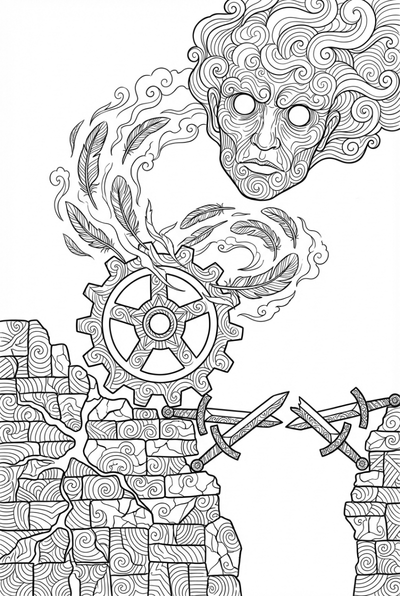 Look at the scene: a crumbling stone wall rises like a cliff, its shards spilling down. Hovering above is a huge gear wheel, its teeth snapping together with invisible partners you can almost feel. Floating above it all, a titan’s head swirls out of clouds, eyes reduced to empty voids. Across the wall’s gap lies a bridge made of broken swords, blades fanning out, while a vortex of feathers and smoke twirls around the gear, drifting toward the titan’s face. The whole design is drawn in crisp black‑ink lines, perfect for filling in with your own colors.
