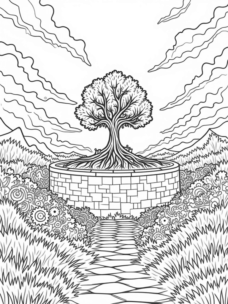In the heart of this enchanting landscape stands a massive tree, its branches sprawling wide and roots diving deep into a cracked stone pathway. This tree seems to be the guardian of the valley, connecting everything together. It’s a perfect spot for kids to let their imaginations run wild as they color in the details and bring the scene to life!