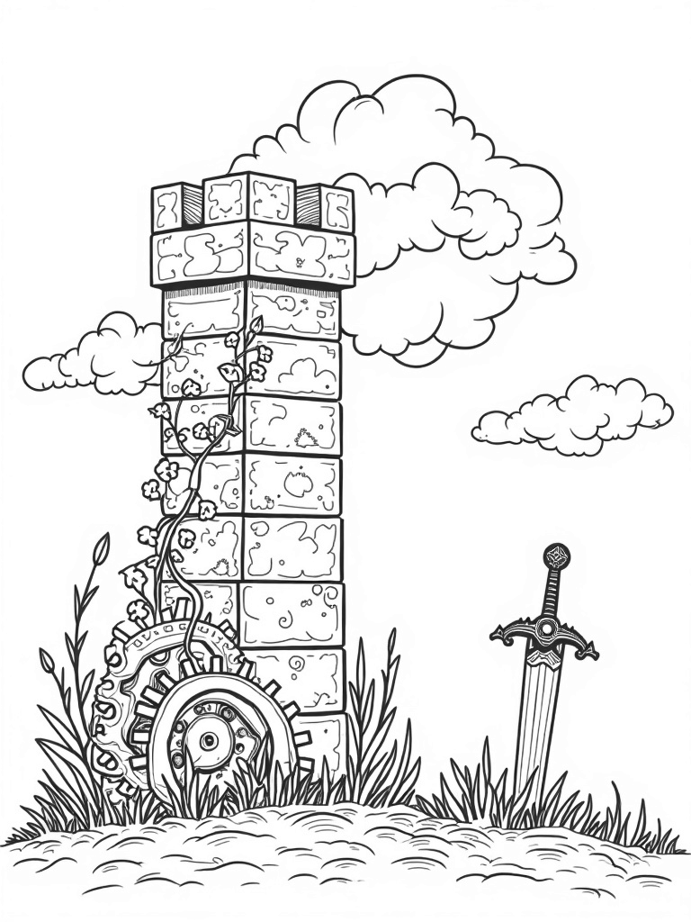Picture a massive wall made up of interlocking stone blocks, stretching tall against a dramatic, cloudy sky. Vines and wildflowers tumble down its sides, adding a splash of color and life. At the bottom, there’s a giant gear peeking out from the ground, rusty but beautifully intricate, like something out of an ancient machine.