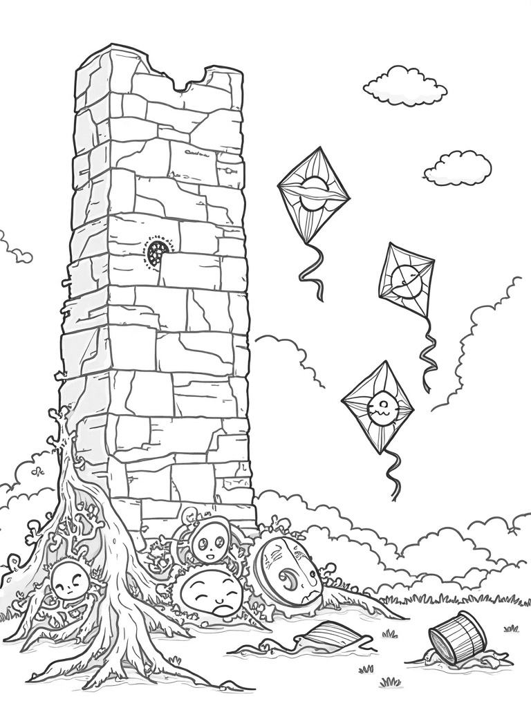 Titan Wall Surrounded by Ancient Roots and Kites Coloring Page