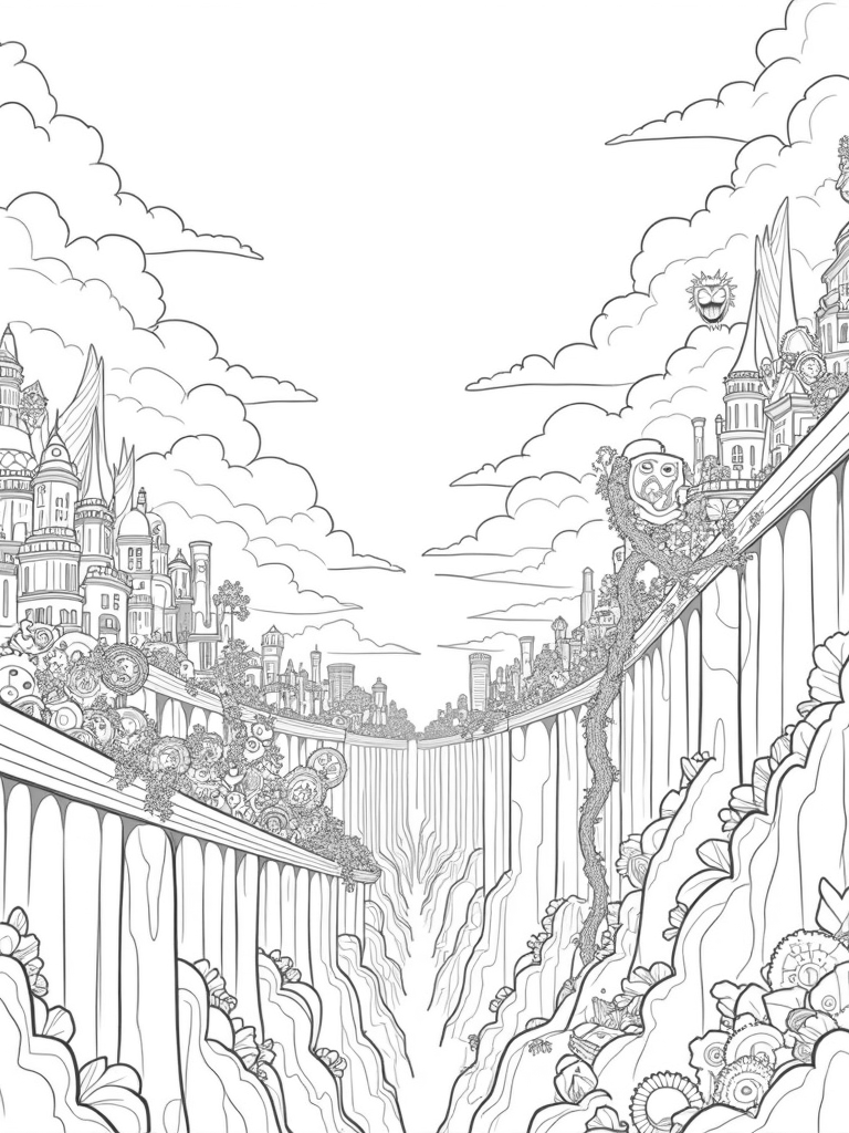 Titan's Cityscape with Colossal Wings and Gears Coloring Page