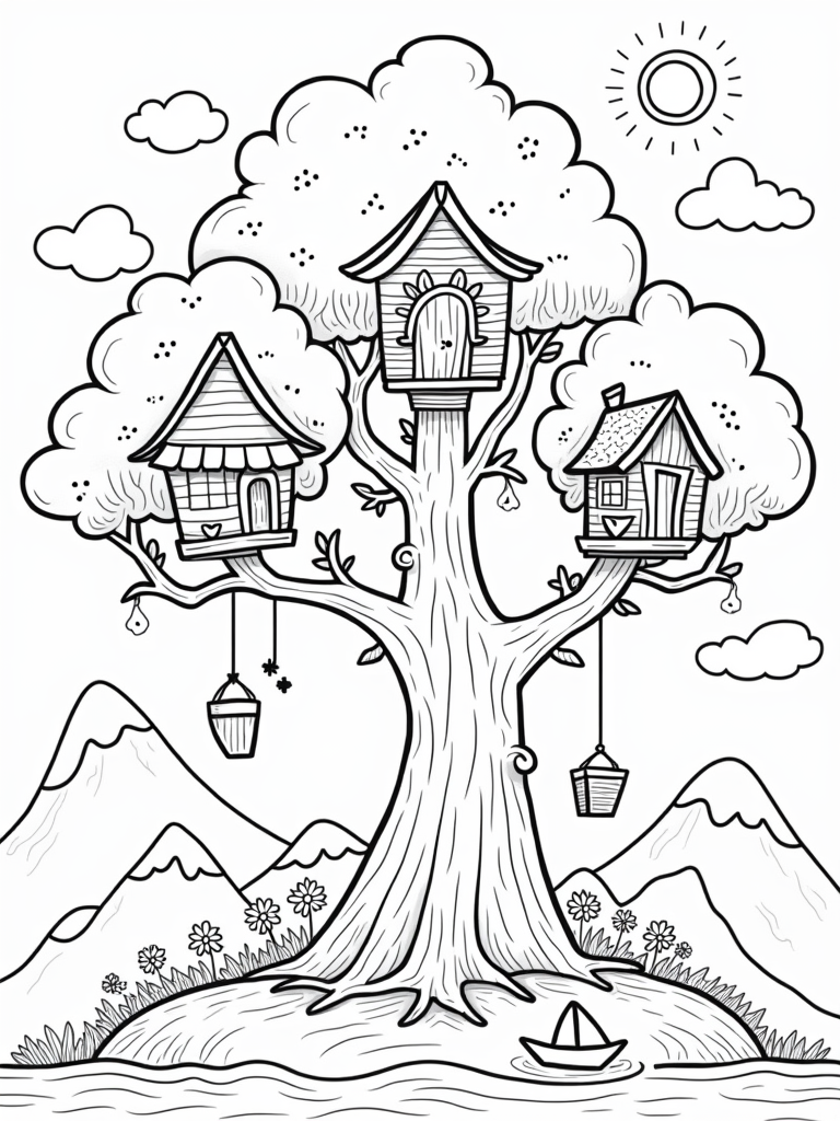 Check out this free, printable coloring page featuring a treehouse village among giant trees! Perfect for kids who love fun and creativity, it’s a great way to spark their imagination. Enjoy coloring this whimsical scene!