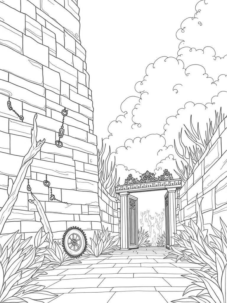 Twisted Wall with Overgrown Courtyard Coloring Page