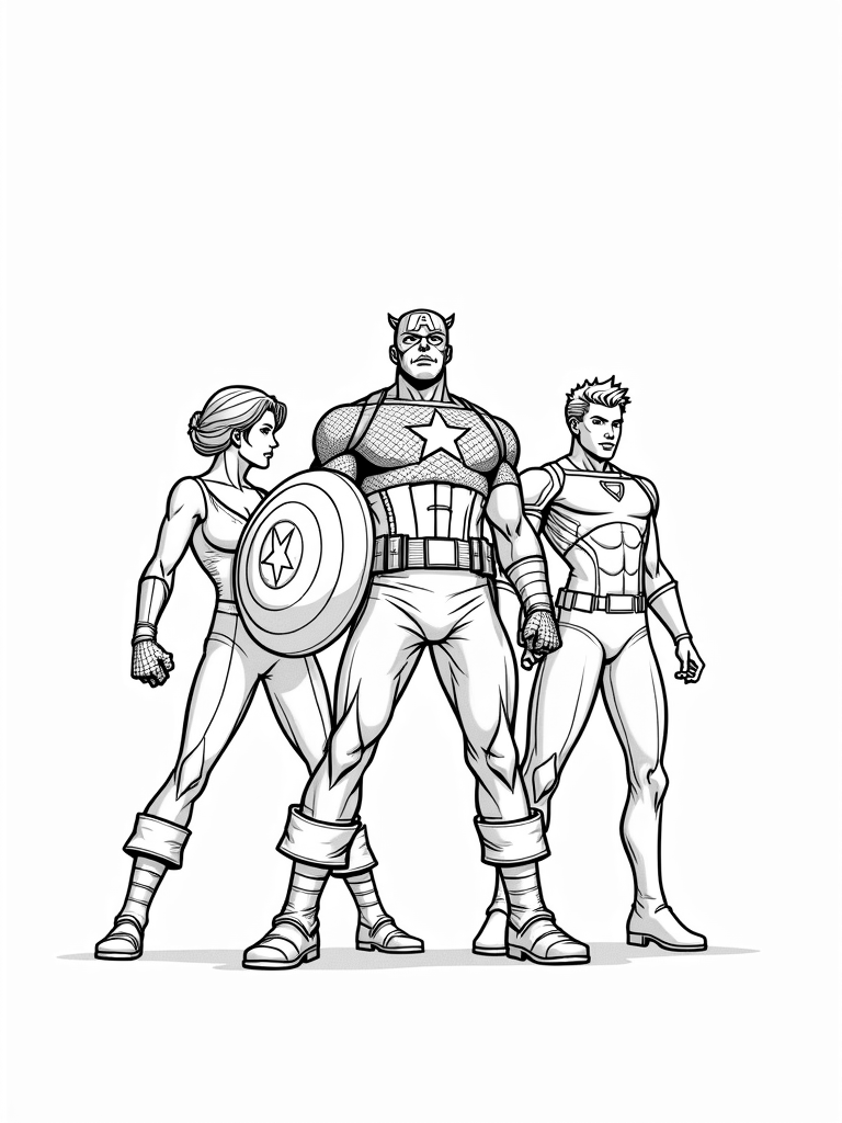 This coloring page is packed with details that make it super fun to color. You can go wild with Captain America's colors, or give Iron Man a shiny new look with your favorite shades of red and gold. Black Widow’s tactical suit and her cool gadgets are waiting for your creative touch. Plus, the city skyline in the background adds even more excitement!