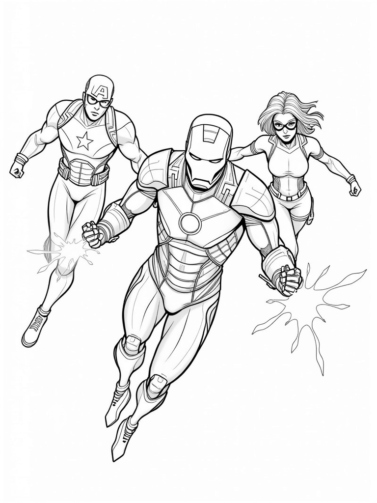 Avengers Assemble: Iron Man, Captain America, and Black Widow in Action Coloring Page