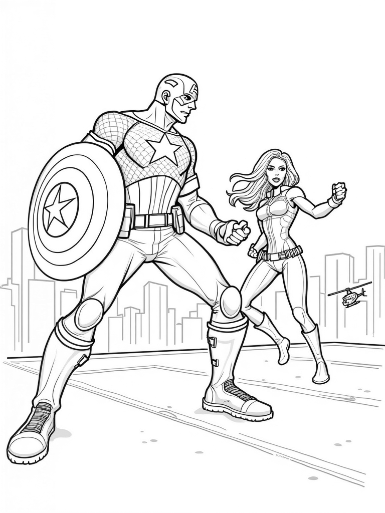 Captain America and Black Widow in Action Coloring Page