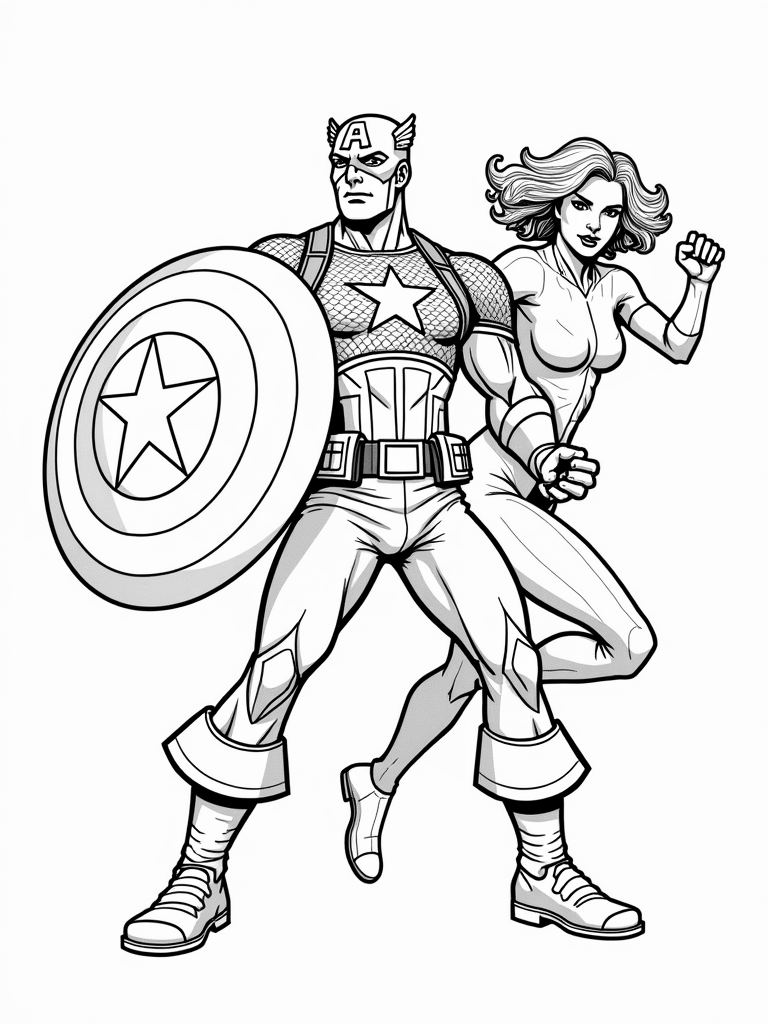 With Captain America's iconic red, white, and blue costume, and Black Widow's sleek black suit, there's so much to color! You can get creative with the details, like the star on Captain America's shield and the red hourglass symbols on Black Widow's outfit. Don’t forget to add some cool effects for their electric batons!