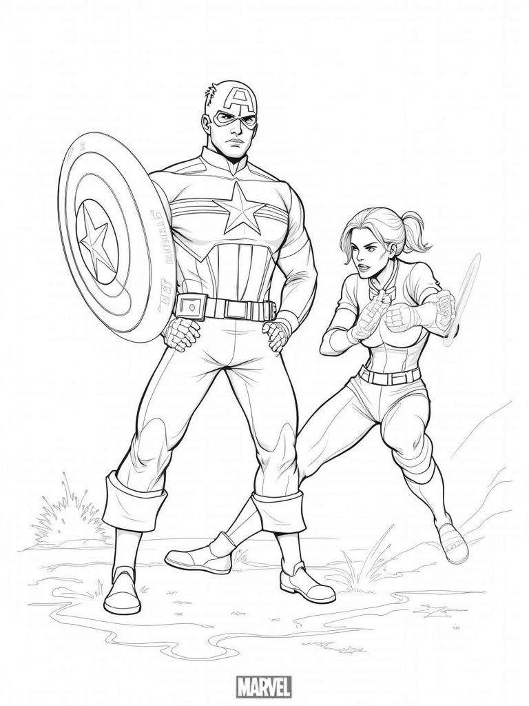 In this exciting coloring page, you’ll find Captain America and Black Widow ready for action! Captain America stands tall, poised to throw his iconic shield, while Black Widow crouches low with her batons, ready to spring into action. Their fierce expressions and dynamic poses capture the essence of teamwork and heroism.