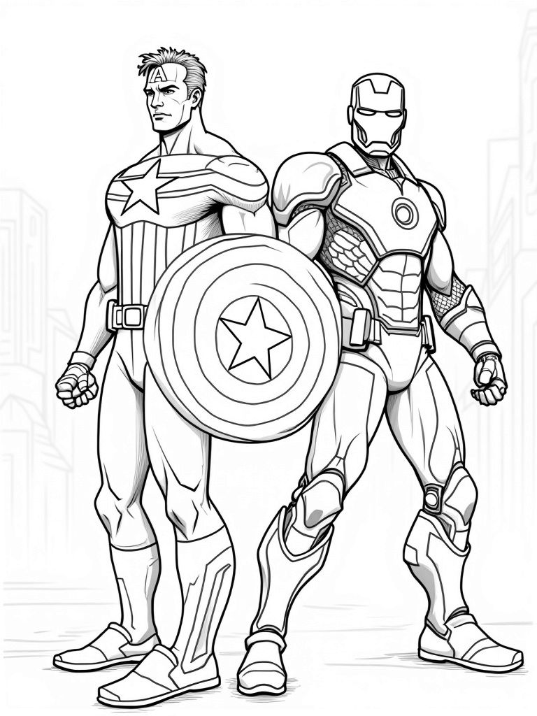 In this exciting scene, Captain America and Iron Man are ready to take on any challenge! They're standing back-to-back, looking tough and ready for action. Captain America is holding his iconic shield, which has seen its fair share of battles, while Iron Man is hovering above the ground, showing off his shiny red and gold armor. The city behind them is buzzing with energy, hinting at an epic fight against villains.