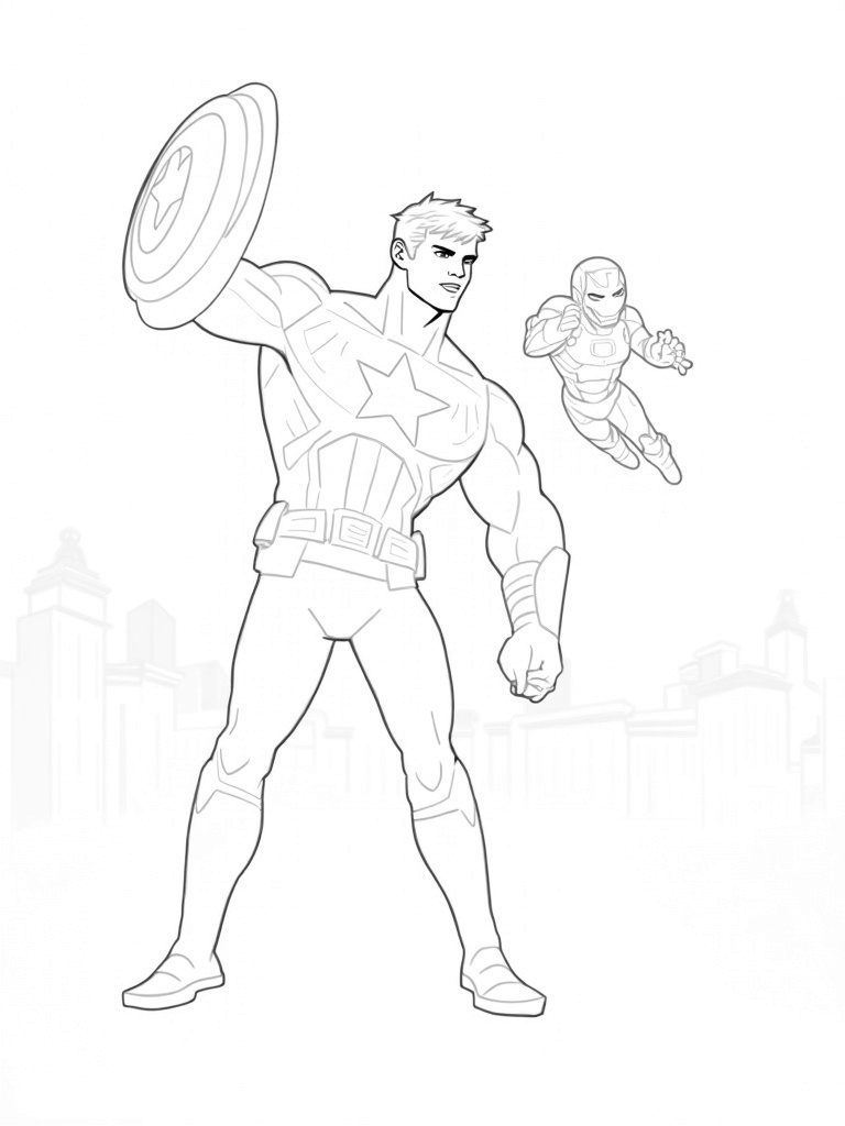 In this exciting illustration, we see Captain America standing tall, ready for anything with his iconic shield held high. His fierce determination shines through, especially with that star-spangled costume! Just above him, Iron Man is soaring through the air, preparing to unleash his repulsor blast. The backdrop of a bustling city adds to the superhero vibe, making it a great canvas for kids to get creative.