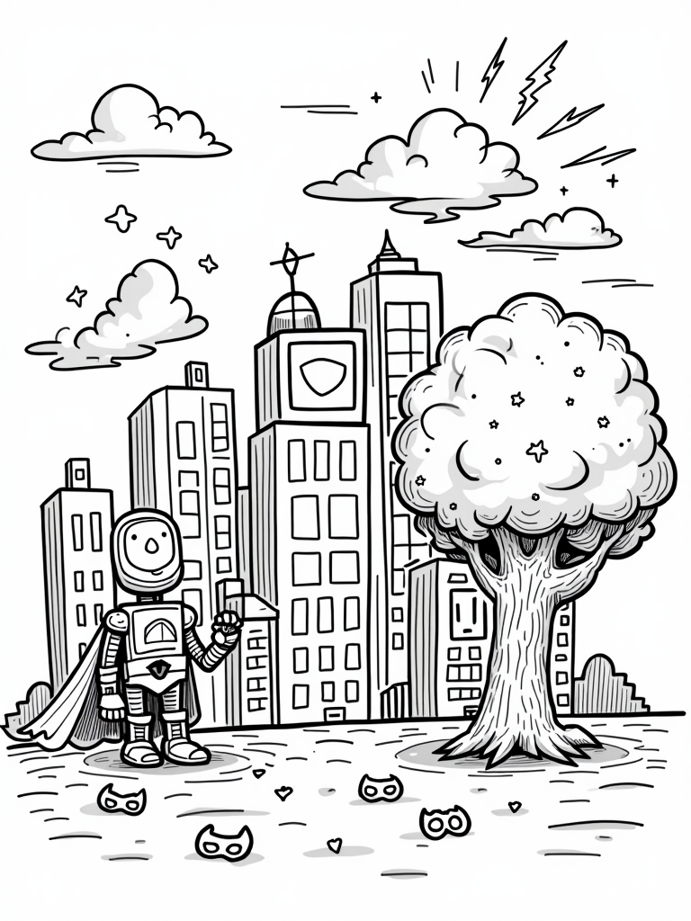 On the ground, a friendly robot with oversized gears stands proudly next to a big, welcoming tree. This isn’t just any tree; its branches are draped with capes, making it look like it’s ready to join in on the fun! Scattered around the base are playful masks and shields, just begging for your colorful creativity. You can mix and match colors to make your own superhero universe!