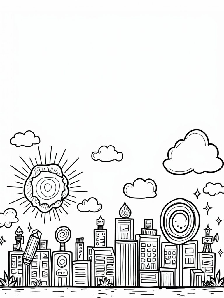 Scattered throughout this vibrant scene are playful robots, each holding oversized pencils. These little guys are eager to join in the fun and ready to draw their own stories. What will you create with them? You can color the buildings, the tree, and the robots however you like, making this a page that’s as unique as your imagination!