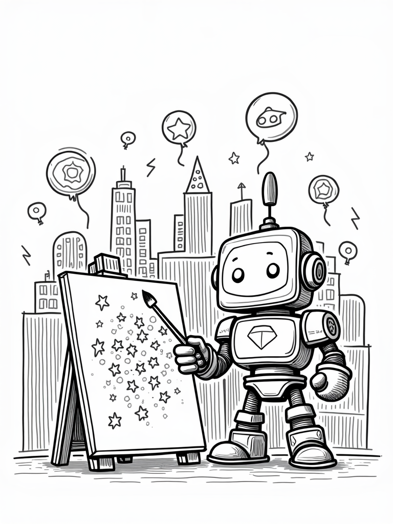 Imagine a skyline where every building is made of colorful blocks, each one sporting a superhero emblem. Above, you’ll see cartoonish shields and hammers floating like balloons, bringing a fun twist to the city. In the foreground, a giant robot, designed to look like a friendly superhero, is hard at work. With an oversized paintbrush in hand, it's splattering bright colors onto a huge canvas, making the whole scene feel alive!
