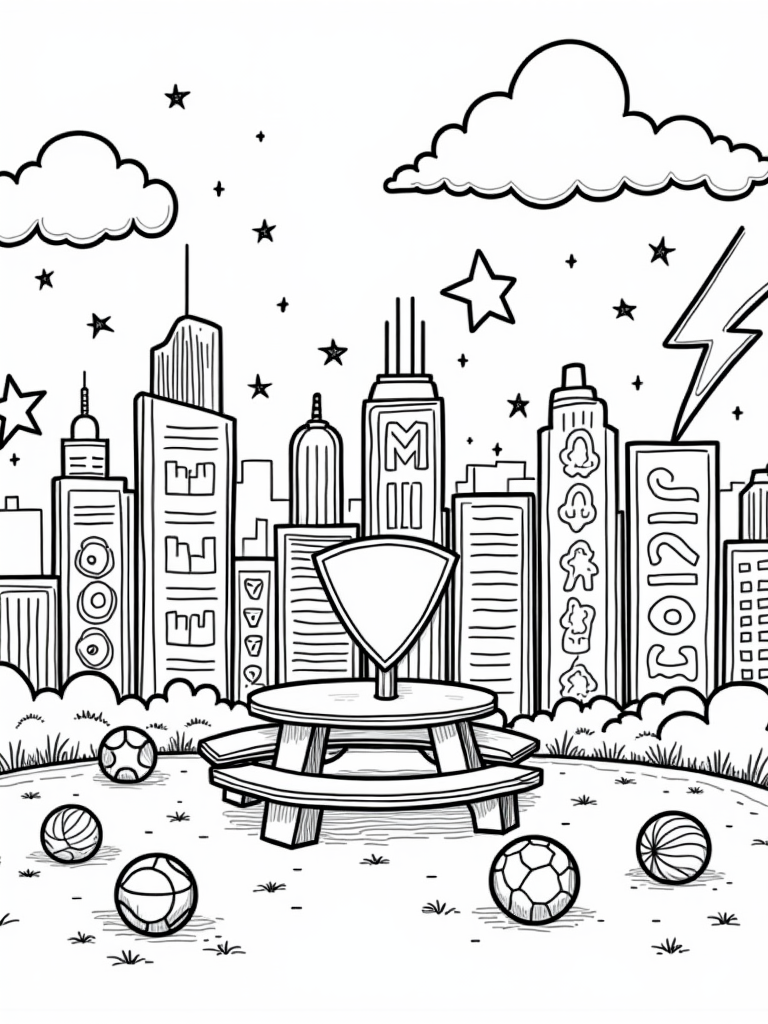 This vibrant city skyline is made entirely of giant comic book panels, each showcasing colorful superhero emblems. In the foreground, there's a massive shield that doubles as a picnic table, perfect for imaginative play. Surrounding it are fun bouncing balls shaped like iconic gadgets that any superhero would love to have!