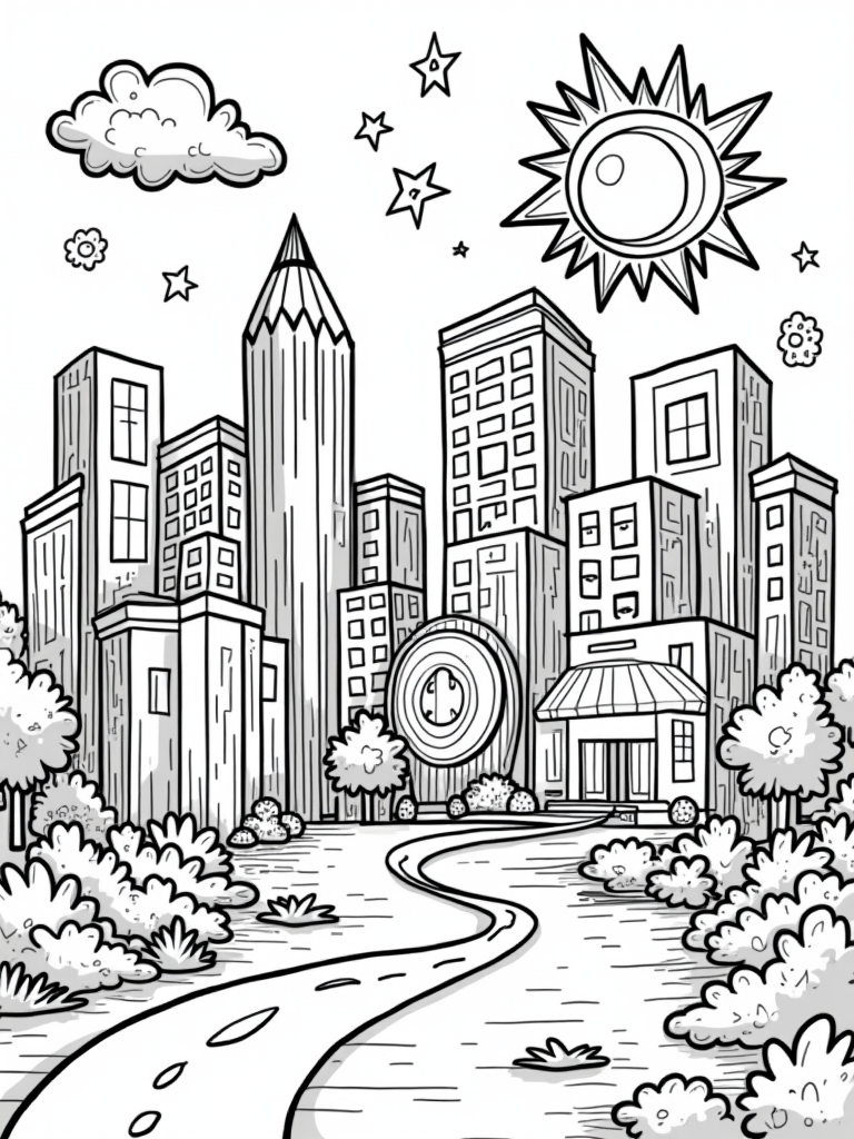 Comic Book Cityscape with Giant Pencil and Colorful Shield Coloring Page