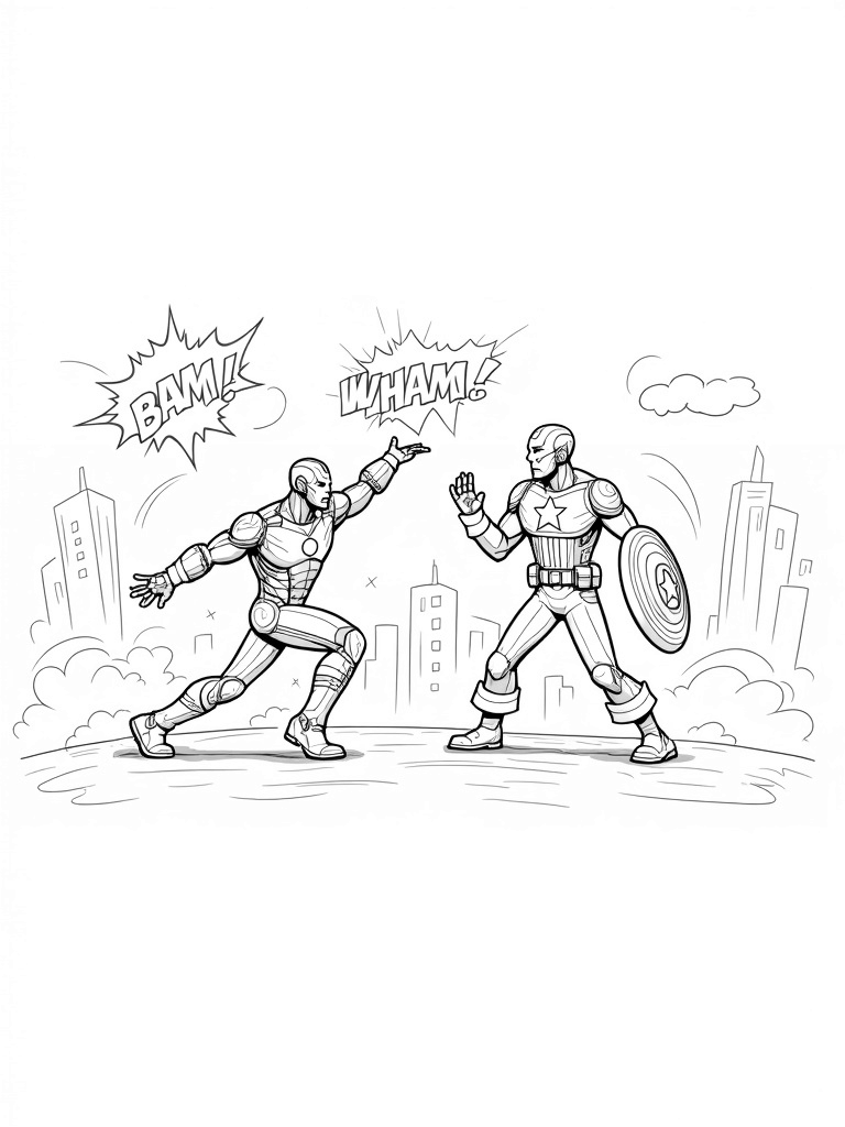 This page is all about the action! Kids can bring Iron Man's high-tech suit and Captain America's heroic outfit to life with their favorite colors. Whether it’s bright reds, blues, or even some wild colors for the city skyline, there’s no limit to the imagination!