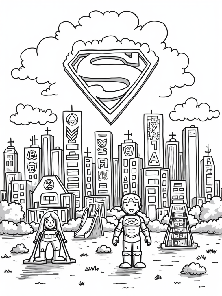 Imagine a bustling city skyline made entirely of building blocks, each one showing off a different superhero's emblem! Above, a massive cloud shaped like a shield floats overhead, casting fun shadows on the colorful streets below. In the foreground, you'll see giant action figures standing proudly on a playground that’s full of surprises, like slides that look like lightning bolts and swing sets designed like iron suits.