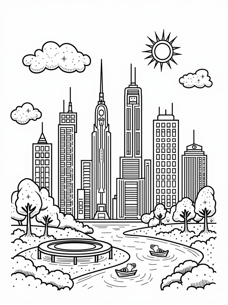 Superhero City Skyline with Bouncing Trampoline Coloring Page