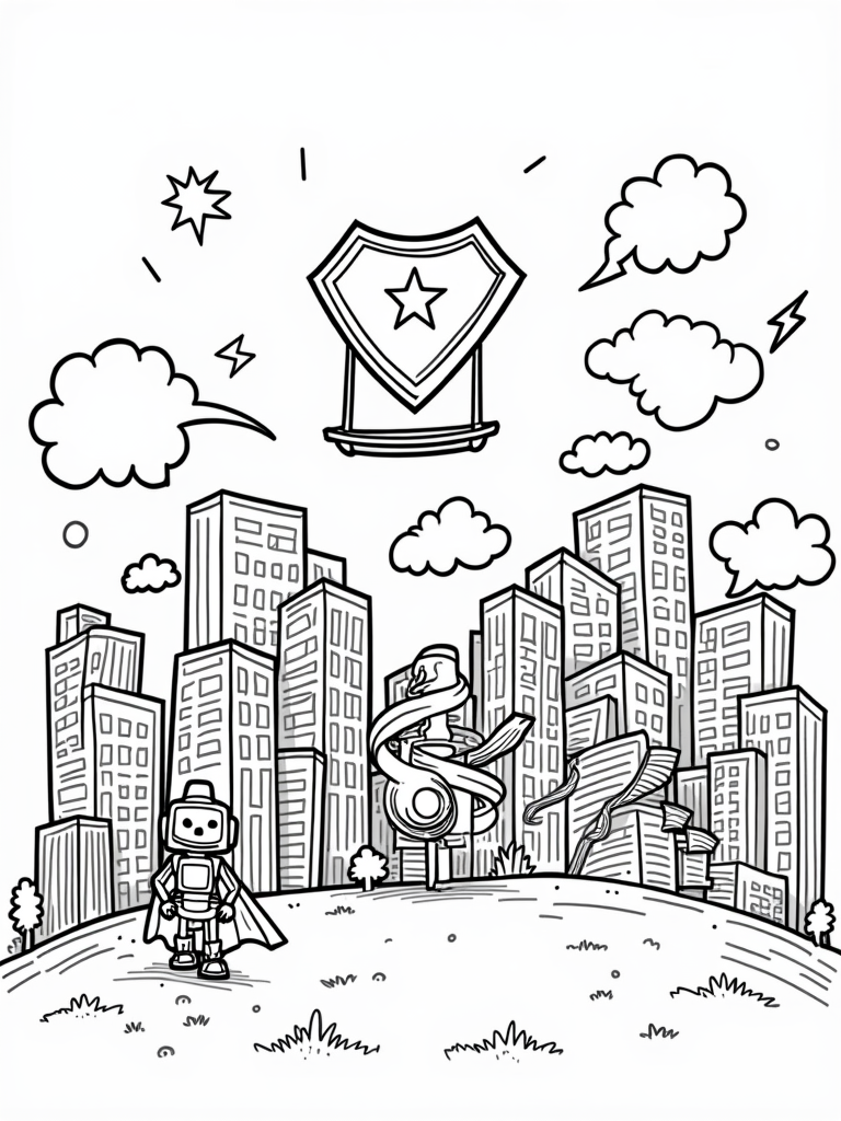 A cheerful robot stands on a grassy hill, proudly holding a sparkling star that adds a fun touch to this lively landscape. Colorful capes flutter between the rooftops, like flags dancing in the breeze. Kids can bring this imaginative world to life with their favorite colors, making each element uniquely theirs!