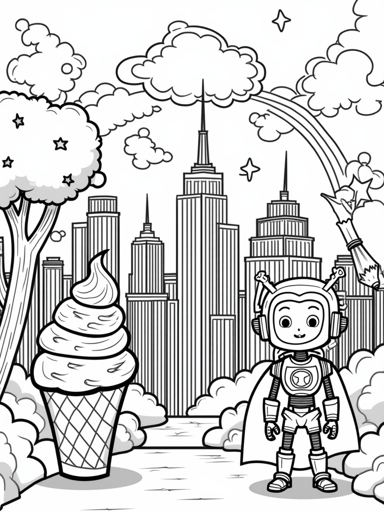 Superhero City with Colorful Ice Cream and a Friendly Robot Coloring Page
