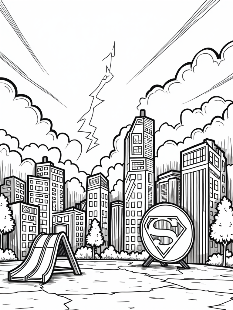 This coloring page shows an oversized comic book city filled with fun buildings shaped like superhero symbols. In the foreground, a giant shield serves as a playground slide, perfect for little superheroes to zoom down! Colorful capes wave like flags from the rooftops, adding a splash of excitement to the sky.