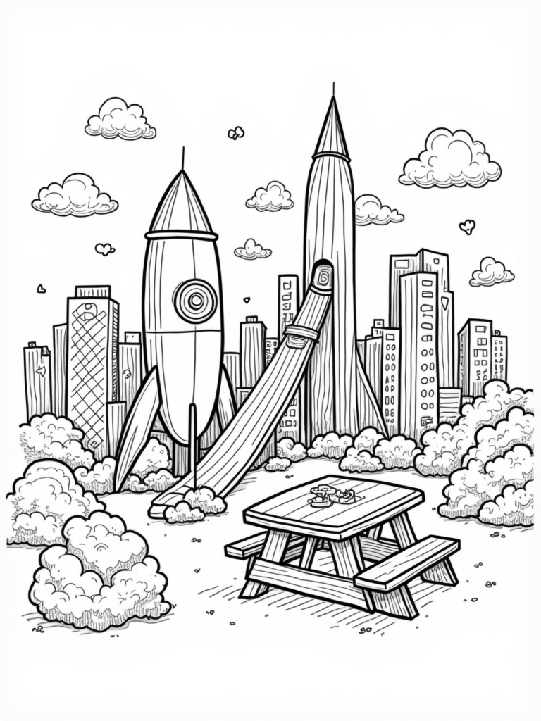 This fun cityscape is buzzing with oversized superhero gadgets that are sure to spark your imagination! In the foreground, a giant shield doubles as a colorful picnic table, surrounded by fluffy clouds. Nearby, a huge pair of goggles transforms into a slide, where kids are gleefully sliding down, giggling all the way!