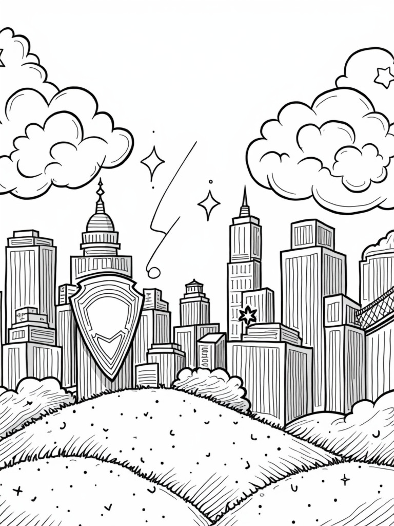Superhero Cityscape with Shield and Lightning Bolt Coloring Page