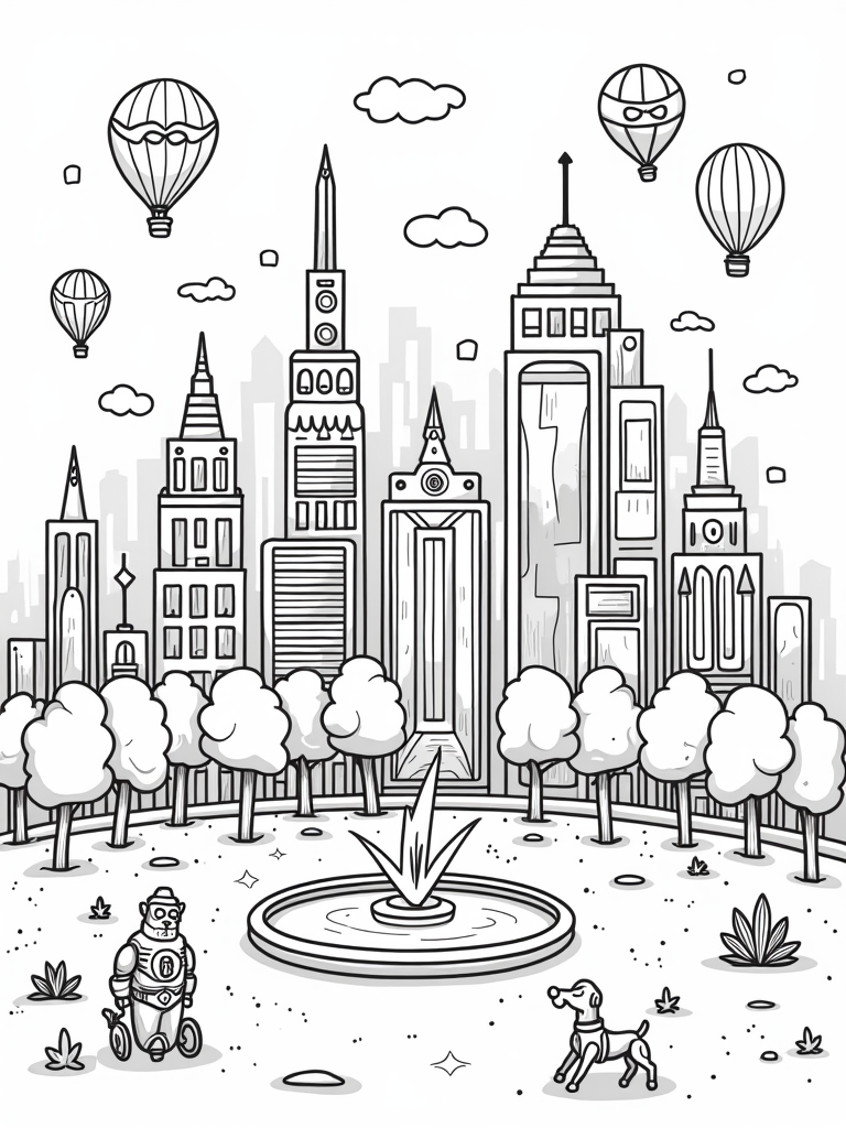 This coloring page showcases a vibrant city where the buildings look just like superhero gadgets! In the center, there's a huge shield-shaped fountain splashing water everywhere, surrounded by quirky trees that resemble lightning bolts. Just nearby, a friendly robot dog is busy fetching a glowing star, adding to the playful atmosphere of this unique city.
