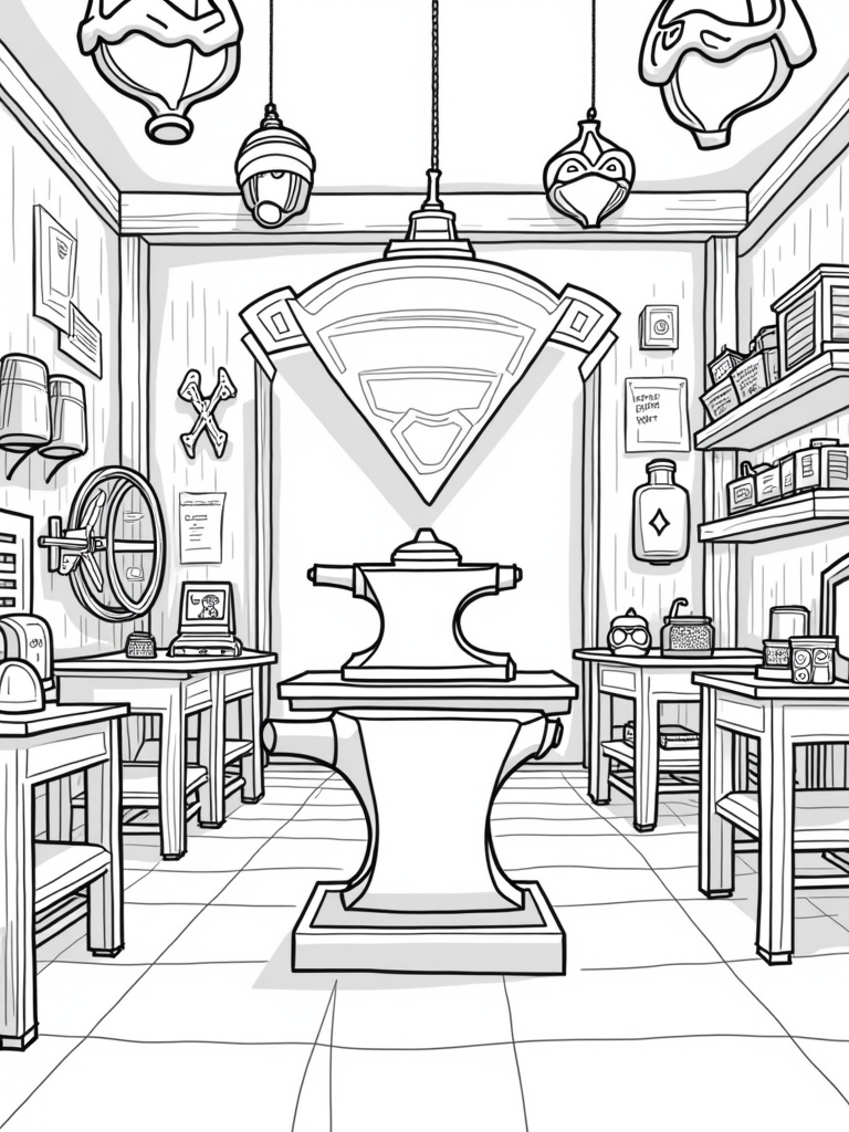 Check out this amazing superhero workshop! Right in the middle, there's a giant anvil shaped like a shield, surrounded by colorful hammers and wrenches. It's like a dream come true for any budding superhero! Over in one corner, a spinning wheel is busy making shimmering capes, perfect for flying around the neighborhood.