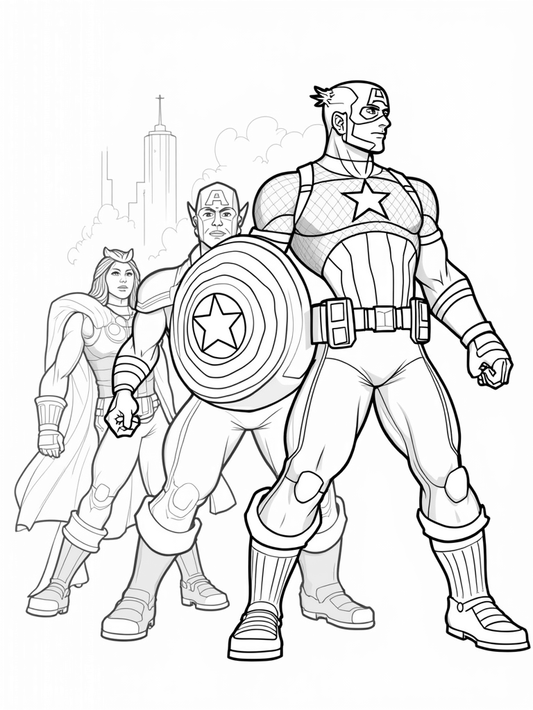 Teamwork in Action with Captain America, Thor, and Black Widow Coloring Page