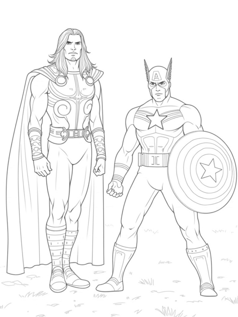 This scene captures Thor and Captain America, two of the coolest Avengers, right in the middle of an epic battle. Thor is on the left, with his long hair and mighty hammer, Mjölnir, ready to strike. His red cape is flowing behind him, giving him that heroic look. On the right, Captain America stands firm, his shield raised and a serious expression on his face. Together, they look like they’re about to take on any villain that comes their way!