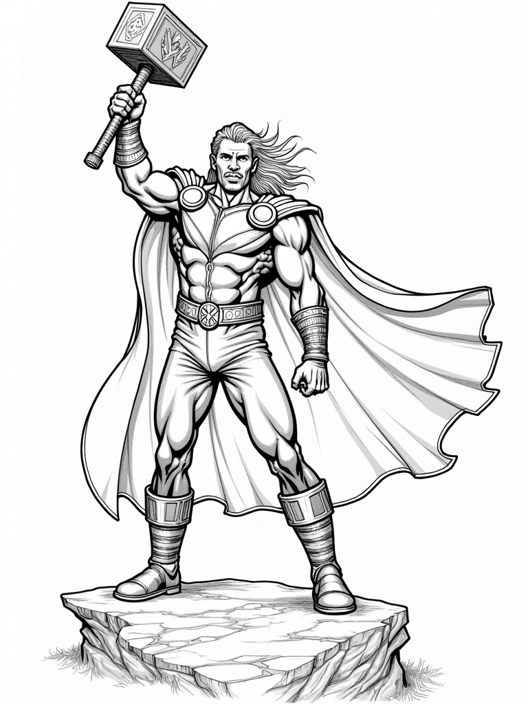 In this action-packed scene, Thor and Captain America are ready to unleash their powers! Thor stands tall on a rocky edge, his mighty hammer Mjolnir raised high, while Captain America crouches protectively, shield at the ready. It's a classic showdown between two of our favorite superheroes, showing their strength and bravery.