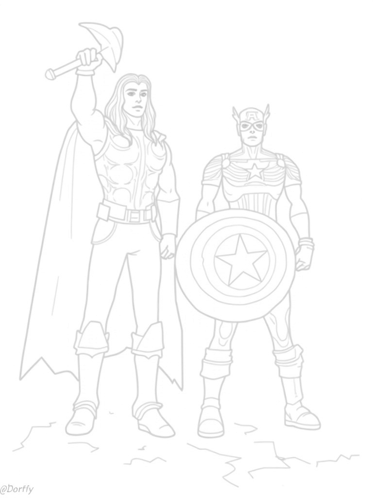 When it's time to color, think about how you want to bring these superheroes to life! Thor’s armor is a mix of silver and dark red, and don’t forget that flowing cape. Captain America’s shield is perfect for some bright colors, so go wild with shades of red, white, and blue. Plus, you can add your own special touches to the background with lightning bolts and battlefield chaos!