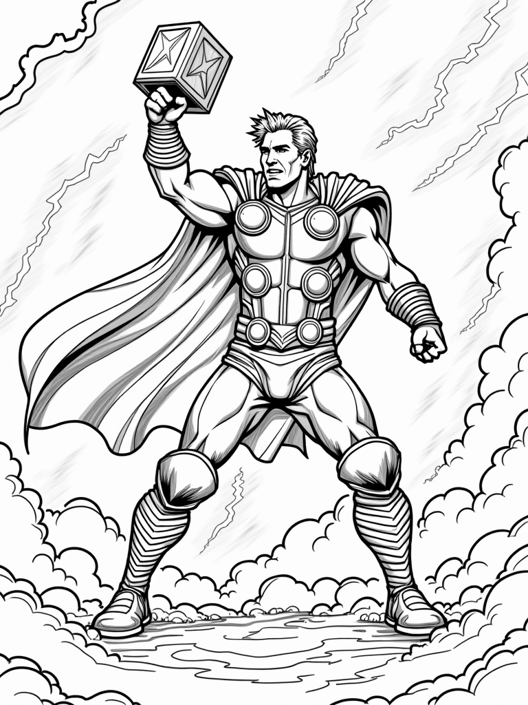 This page is a fantastic chance for kids to get creative. With Thor’s stormy background and Captain Marvel’s cosmic elements, you can choose bright yellows and whites for the lightning and explore vibrant colors for the stars and nebulas. There’s no wrong way to color this scene—you can make it as colorful as your imagination allows!