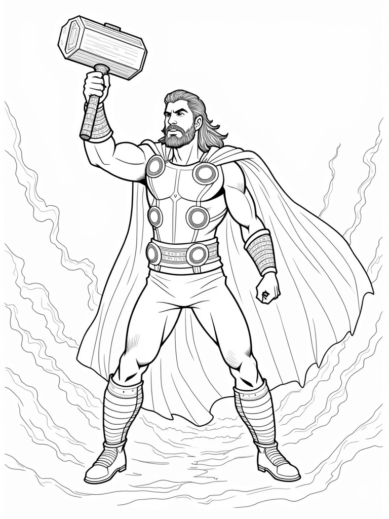 This coloring page is perfect for kids who love superheroes and epic battles. With bold outlines and fun patterns in their armor, there's plenty of room for imagination. Color Thor’s iconic red cape and Valkyrie’s sleek black armor however you like! Will you add your own twist to the background with mythical creatures or extra lightning bolts? The choice is yours!