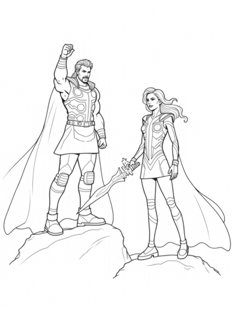 Check out this free, printable coloring page featuring Thor and Valkyrie from the Avengers! Perfect for kids who love superheroes, this scene captures all the action and magic of Asgard.