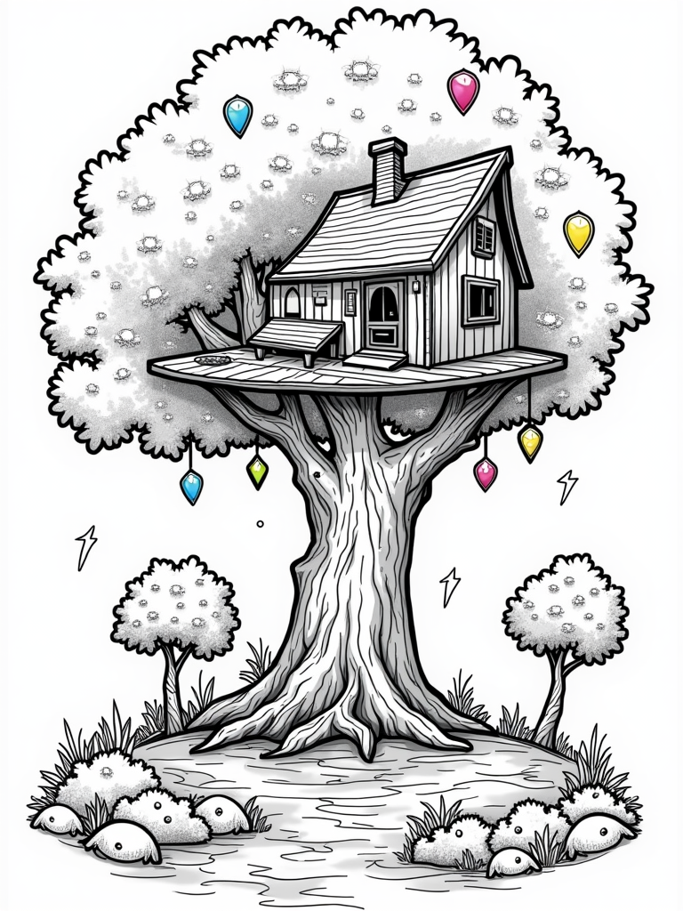 Treehouse Fortress with Friendly Robots and Lightning Fish Coloring Page