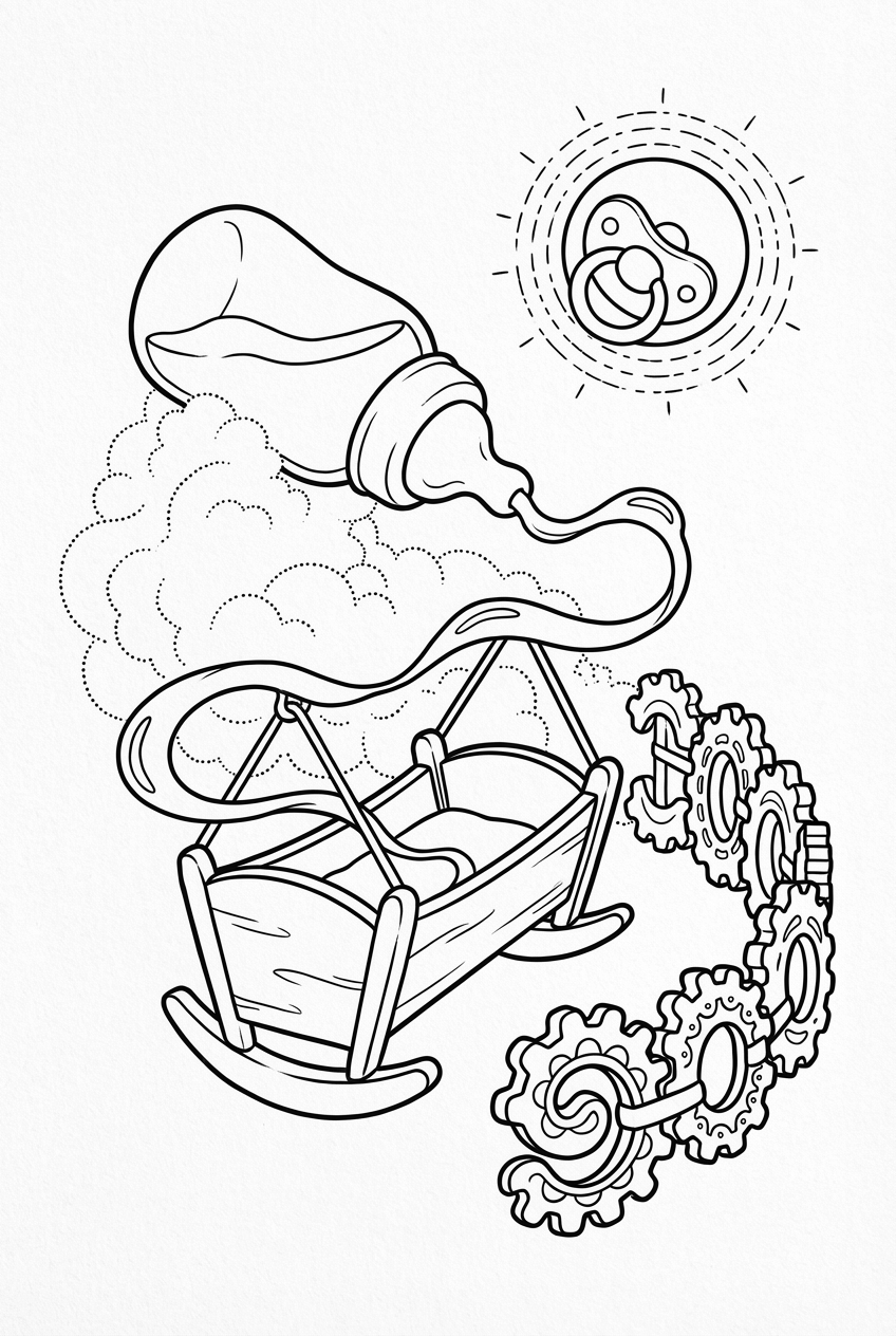 Kids love the mix of familiar baby stuff and whimsical twists. The big bottle and cozy cradle feel like bedtime stories, and the pacifier moon adds a dreamy touch. The gear tower is like a puzzle you can color piece by piece, which keeps little hands busy and imaginations rolling. Grab your crayons and give each element its own splash of color—maybe a pink bottle, a sky‑blue cradle, and a rainbow‑hued gear tower.