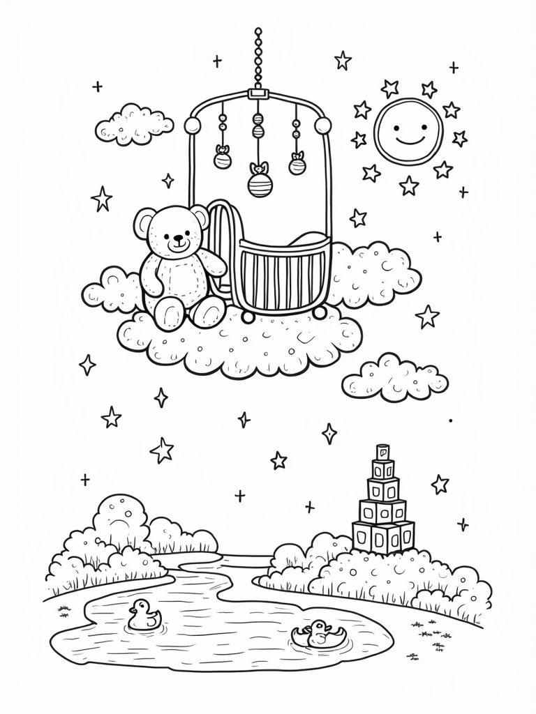 Imagine a dreamy nursery floating on soft, fluffy clouds! There’s a crib made of candy canes, all decked out with a cozy patchwork quilt. Right next to it, a giant teddy bear is waiting for a cuddle. Above, colorful mobile toys hang, ready to twirl and dance in the sky. Below, a gentle stream flows, where pastel rubber ducks bob along happily.