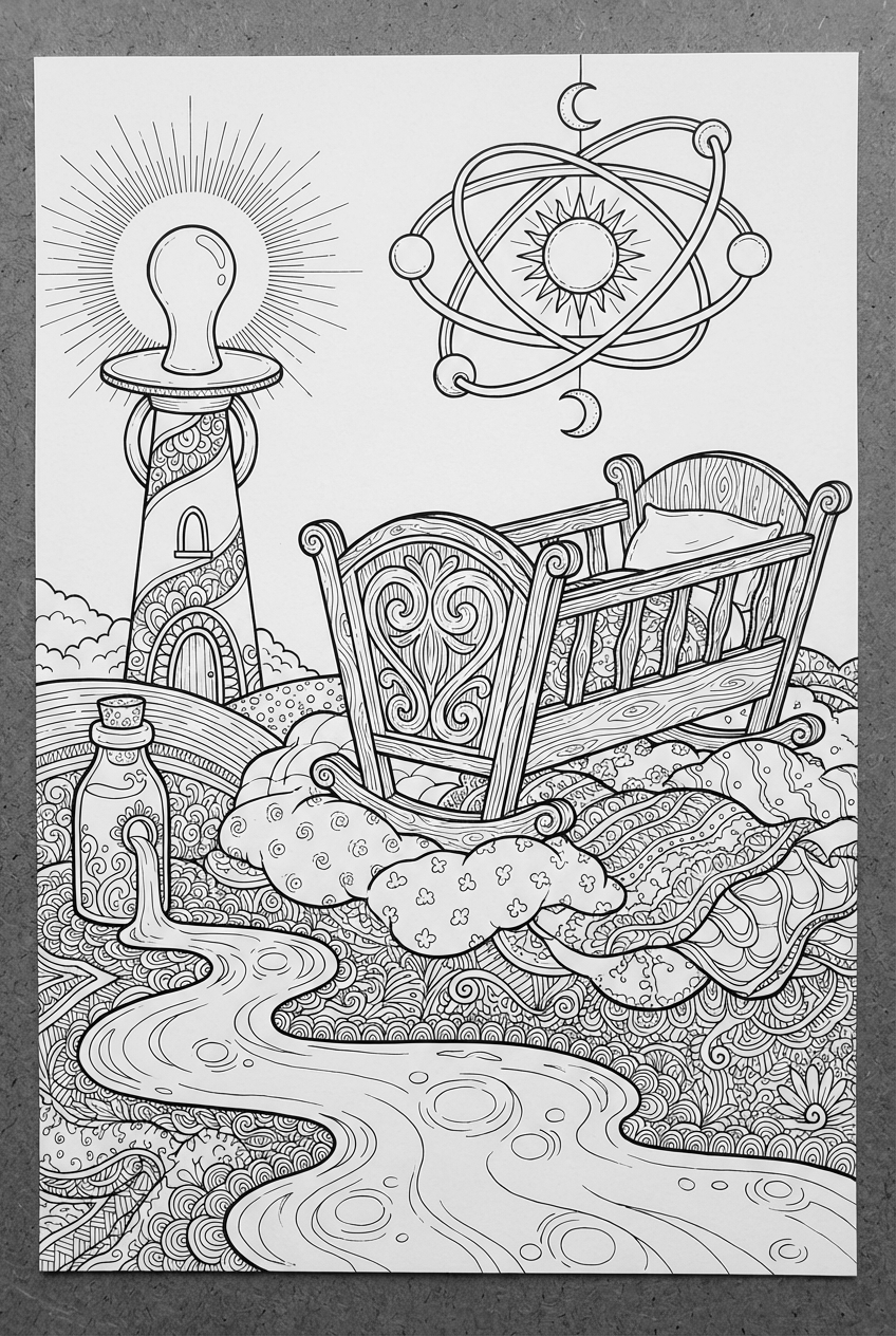 Look closely and you’ll spot a huge wooden cradle sitting on a mound of fluffy blankets, all under a sky of swirled pastel clouds. Right next to it, a towering pacifier stands tall like a lighthouse, its rim glowing with a soft halo. Above, tiny moons made from teething rings spin around a bright rattle‑sun, while a gentle river of milk streams from a silver bottle fountain and winds through the whole scene.