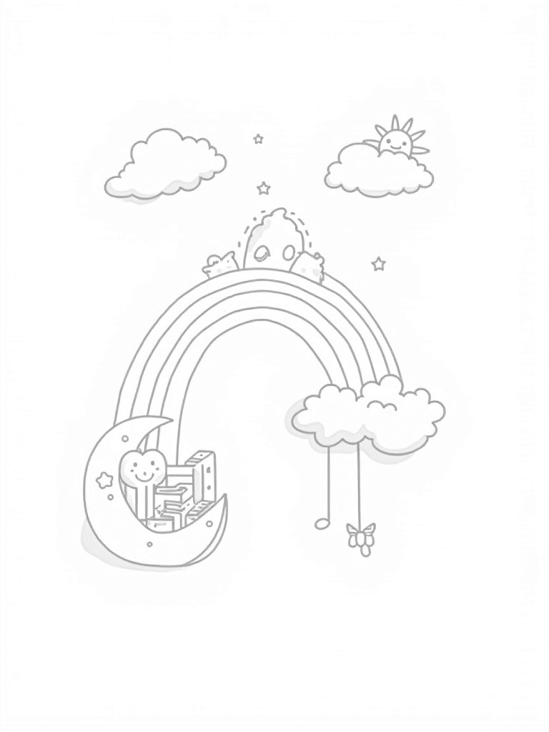 This coloring page shows a dreamy nursery floating in the clouds. You’ll spot a cozy crib shaped like a crescent moon, perfectly cradling a stack of colorful building blocks. Above, a mobile of stars and moons twirls gently, casting fun shadows on the soft, fluffy cloud floor. There's even a rainbow bridge made of giant plush toys connecting the clouds!