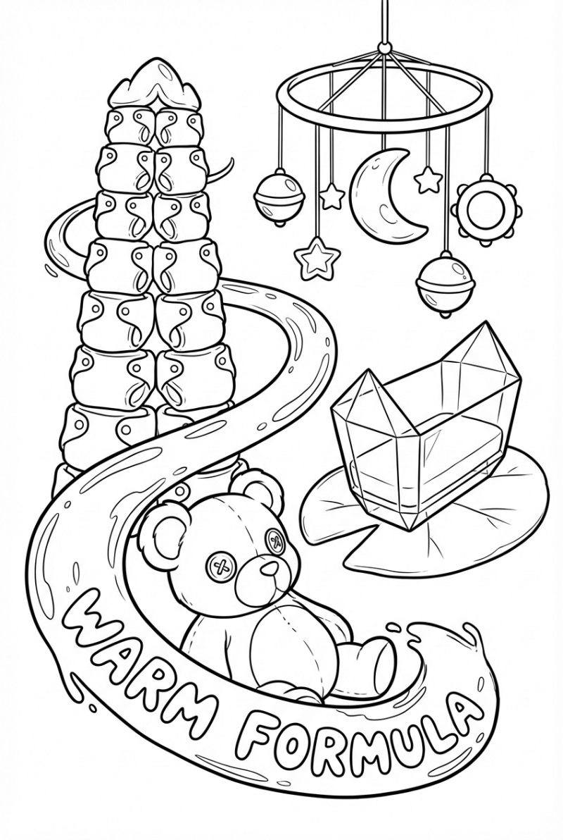 Kids get a kick out of the silly mix of baby gear and fantasy. Coloring the diaper tower lets them practice big, rounded shapes, while the river and teddy give a chance to blend blues and browns. The rattles and nightlight add sparkle opportunities, and the floating crib is perfect for dreamy pastel hues. It’s a fun, stress‑free way to explore baby‑world imagination.