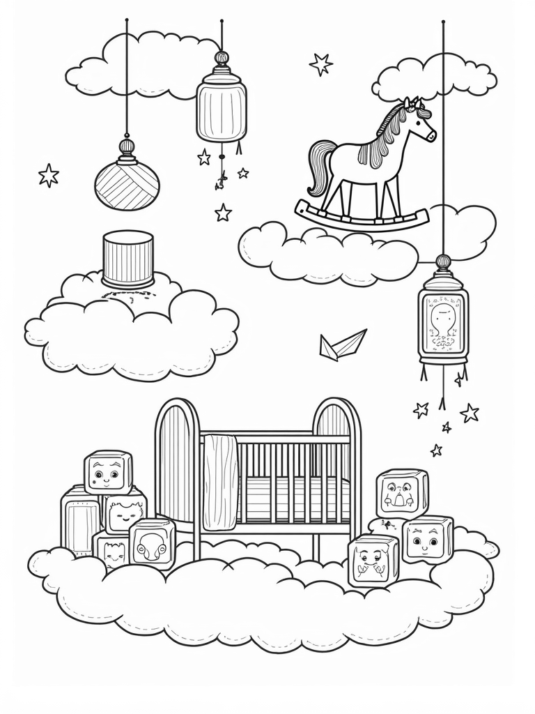 Look closely at the mobile in the corner, spinning slowly with stars and moons, each one decorated with fun patterns just waiting for your crayons. And don’t forget about the cute plush toys scattered around, each with big, friendly eyes that will invite you to play. At the center of it all, there’s a whimsical crib made from pastel blocks, draped in pretty ribbons. It’s a magical place just waiting for your artistic touch!