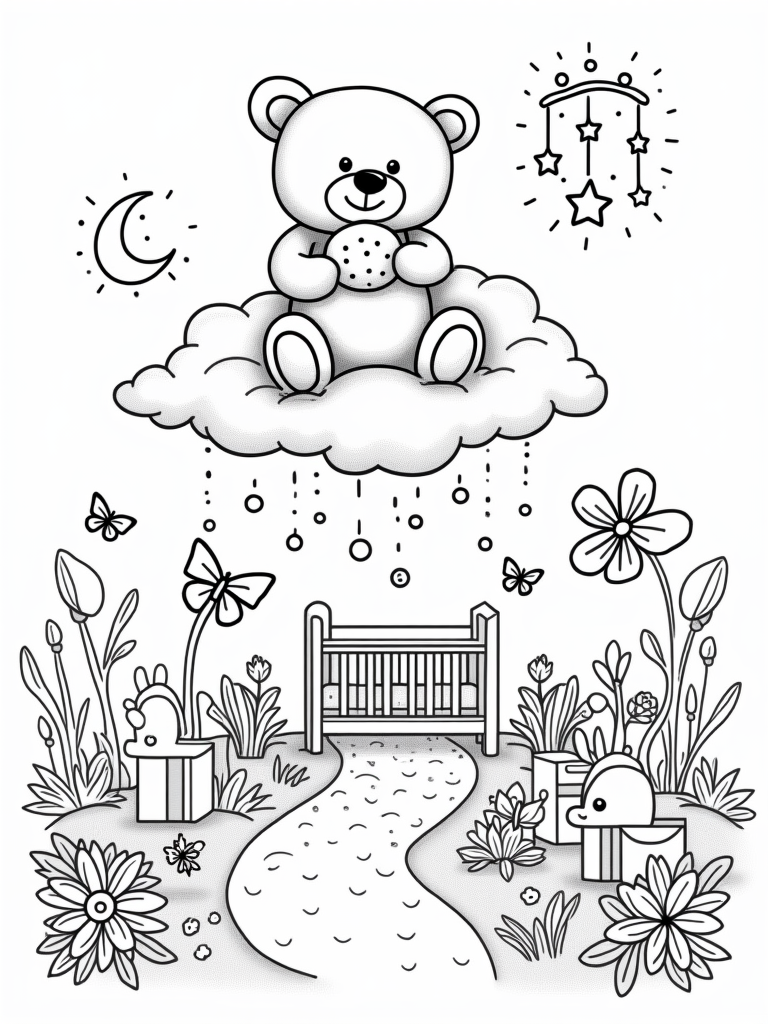 This free, printable coloring page is all about a dreamy nursery filled with oversized soft toys. Kids will love bringing the giant plush bear, cheerful sun, and fluttering butterflies to life with their favorite colors!