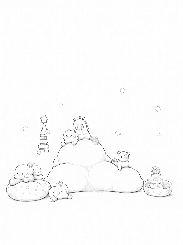 Dreamy Nursery with Floating Clouds and Plush Toys Coloring Page