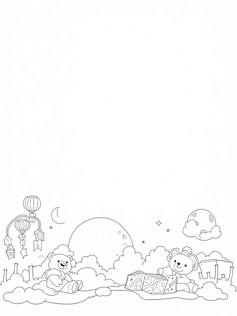 Imagine a cozy nursery filled with oversized plush toys just waiting to be colored! Fluffy clouds float gently around the room, while a giant mobile spins above, showcasing stars, moons, and adorable little hot air balloons. Below, a soft, oversized blanket welcomes your crayons, dotted with fun patterned blocks and colorful rattles that can spark any child’s imagination.
