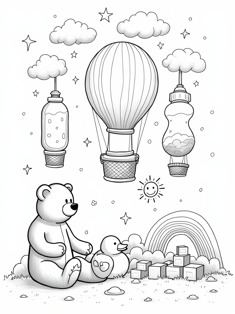 Floating Nursery with Baby Bottle Hot Air Balloons Coloring Page